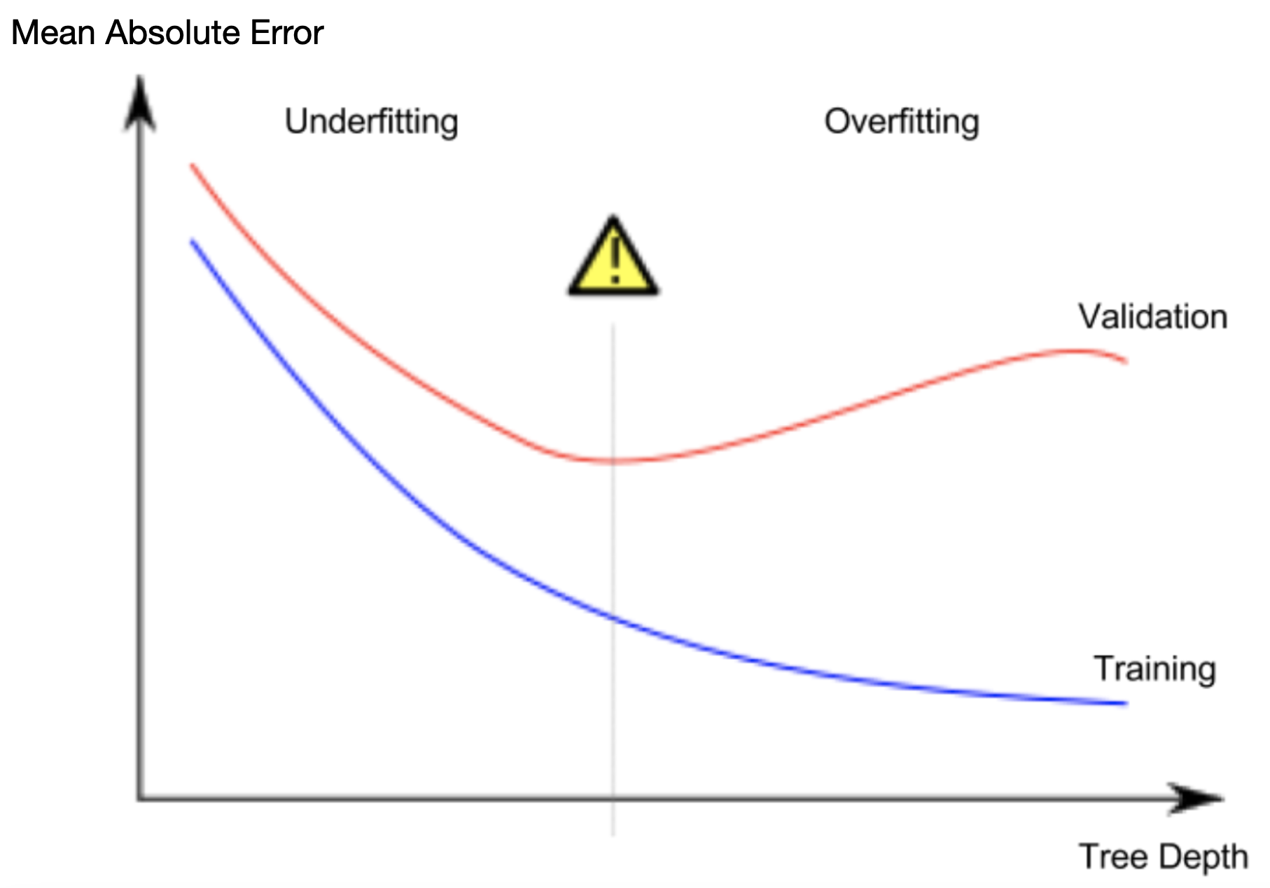 Es tracta d'un fenomen anomenat sobreajust o overfitting, on un model coincideix amb les dades d'entrenament quasi perfectament, però funciona malament en la validació i altres dades noves. D'altra banda, si fem que el nostre arbre siga molt poc profund, no divideix les cases en grups molt diferenciats.